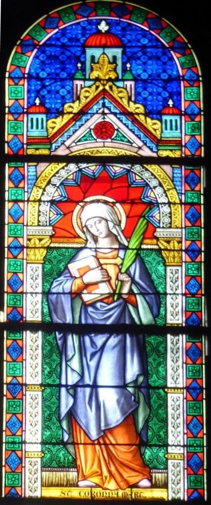 La cathédrale de Strasbourg abrite un vitrail du XIVème siècle représentant Sainte Corona en longue robe, avec le manteau et le voile, tenant la palme du martyre dans la main gauche.