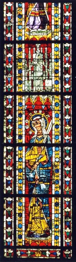 La cathédrale de Strasbourg, abrite un vitrail du XIVe siècle la représentant en longue robe, avec le manteau et le voile, tenant la palme du martyre dans la main gauche. Des représentations plus tardives la montrent tenant dans sa main droite une pièce de monnaie qu'elle tend à un mendiant.