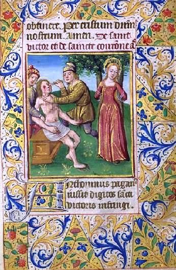 Miniature enluminée du martyre des saints Victor et Corona, sur une feuille pleine d'un livre d'heures , France (Paris), ca. 1480.